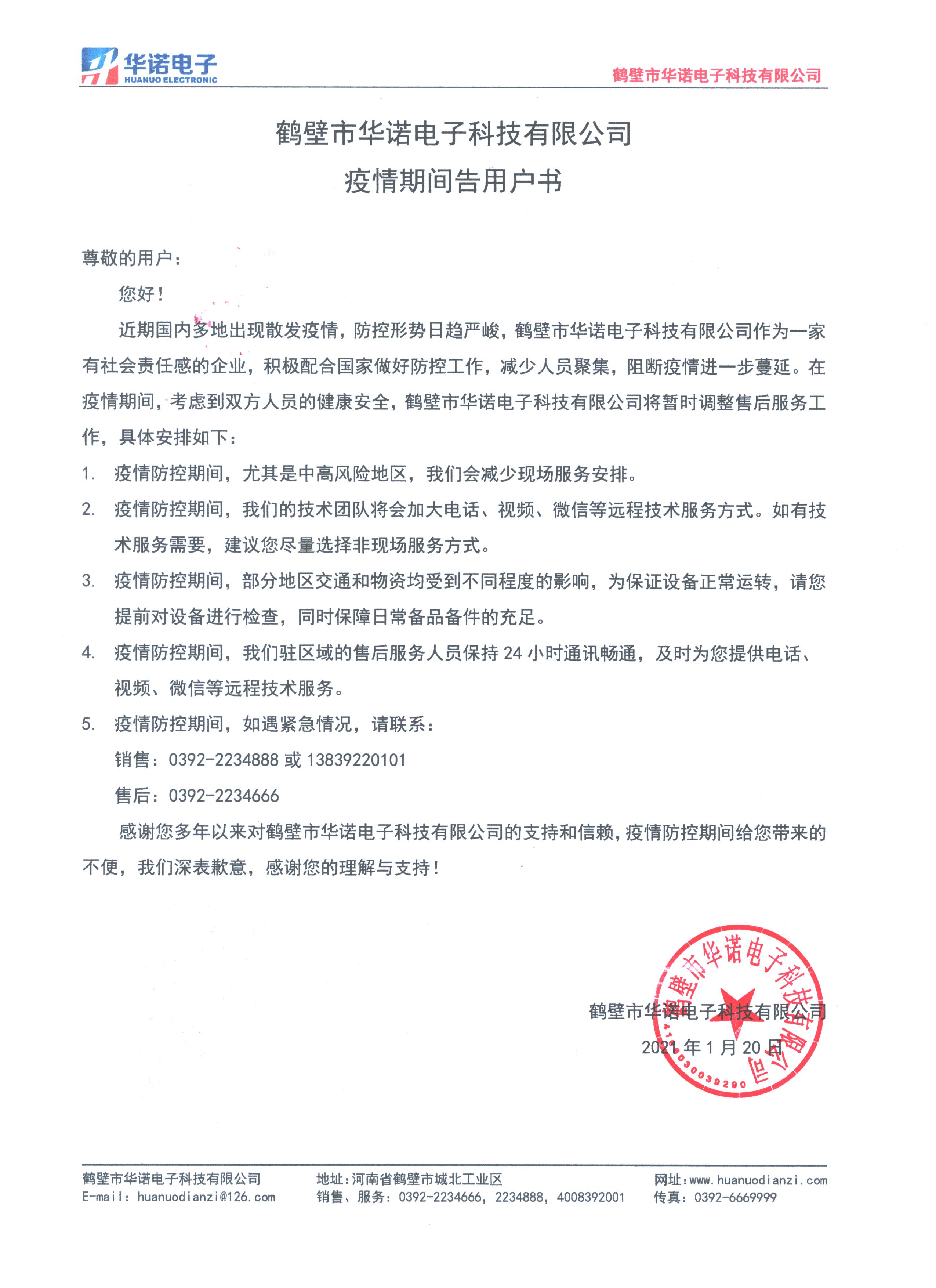 感謝您多年以來(lái)對(duì)鶴壁市華諾電子科技有限公司的支持和信賴,疫情防控期間給您帶來(lái)的不便,我們深表歉意,感謝您的理解與支持!