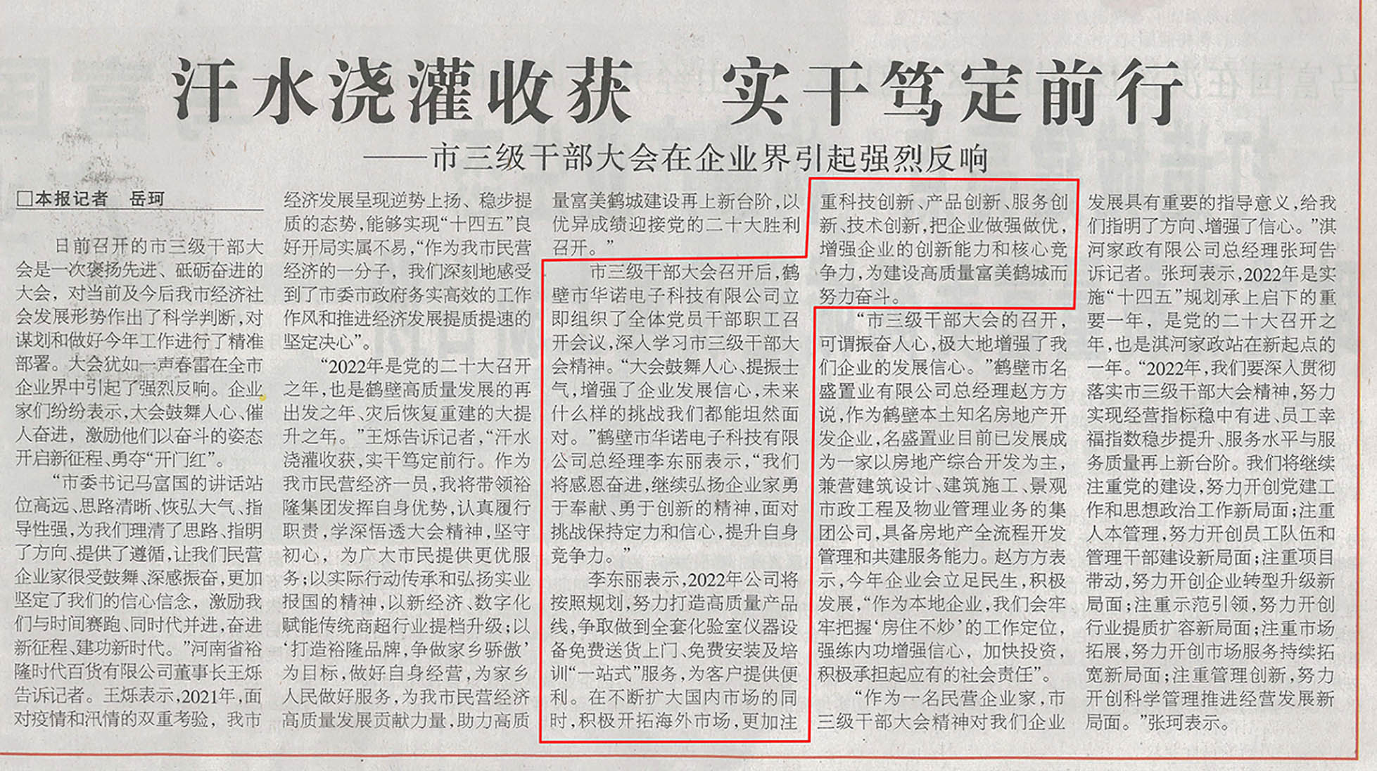 近日,為學習貫徹鶴壁市三級干部大會精神,鶴壁市華諾電子科技有限公司全體黨員干部積極參加。作為煤炭化驗設(shè)備行業(yè)優(yōu)秀企業(yè),鶴壁日報針對此次會議對華諾電子進行報道。